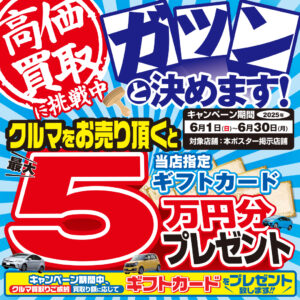 クルマを売ると最大5万円分のギフトカードプレゼント! ■6月1日(日)から6月30日(月)まで実施 クルマを売るなら今がお得!おクルマ買取ご成約で買取額に応じて最大5万円分のギフトカードをプレゼントします。 あなたの愛車、高価買取に挑...
