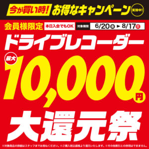 ドラレコ最大1万円大還元祭【6/20~8/17】 オートバックス会員限定、ドライブレコーダー大還元祭を2025年6月20日(金)~2025年8月17日(日)まで実施いたします。 オートバックス会員様[入会金・年会費無料/当日入会可...