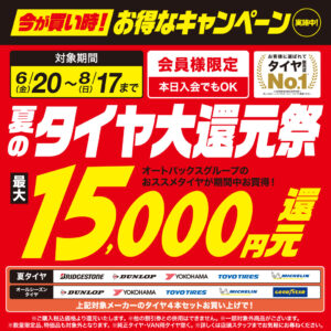 夏のタイヤ大還元祭【6/20~8/17】 オートバックス会員限定、夏のタイヤ大還元祭を6月20日(金)~8月17日(日)まで実施いたします。 オートバックス会員様[入会金・年会費無料/当日入会可] 対象の夏タイヤ4本セッ...