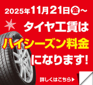 2025年-2026年冬 スタッドレスタイヤへの履き替えはお早めに! ☃スタッドレスタイヤへの履き替えはお早めに!☃毎年11月から翌年1月までは夏タイヤから冬タイヤへの履き替え作業が混雑します。冬タイヤへの履き替えをご希望のお客様は早めにご予約くださ...