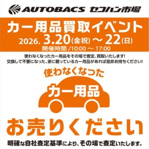 オートバックス海老名限定!3月20日(金/祝)~22日(日) カー用品買取イベント開催! 不要になったカー用品、ご自宅に眠っていませんか? 例えば、前に乗っていたおクルマ用の冬タイヤやタイヤチェーンなど。例えば、いつか使うかもと取っておいたけど、使う事が無いカー用品...