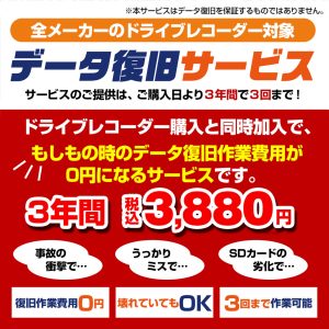 ドライブレコーダーと同時購入がお薦め! SDカード「データ復旧サービス」 ドライブレコーダーのご購入と同時加入で、もしもの時のデータ復旧費用が0円になる「データ復旧サービス」をお薦め致します。 事故の衝撃でデータが破損してしまった場合や誤ってデータを消去...